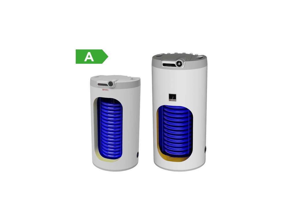 Stacionární zásobník s jedním výměníkem a vstupy i výstupy v horním víku vhodný pro instalaci pod závěsné kotle.