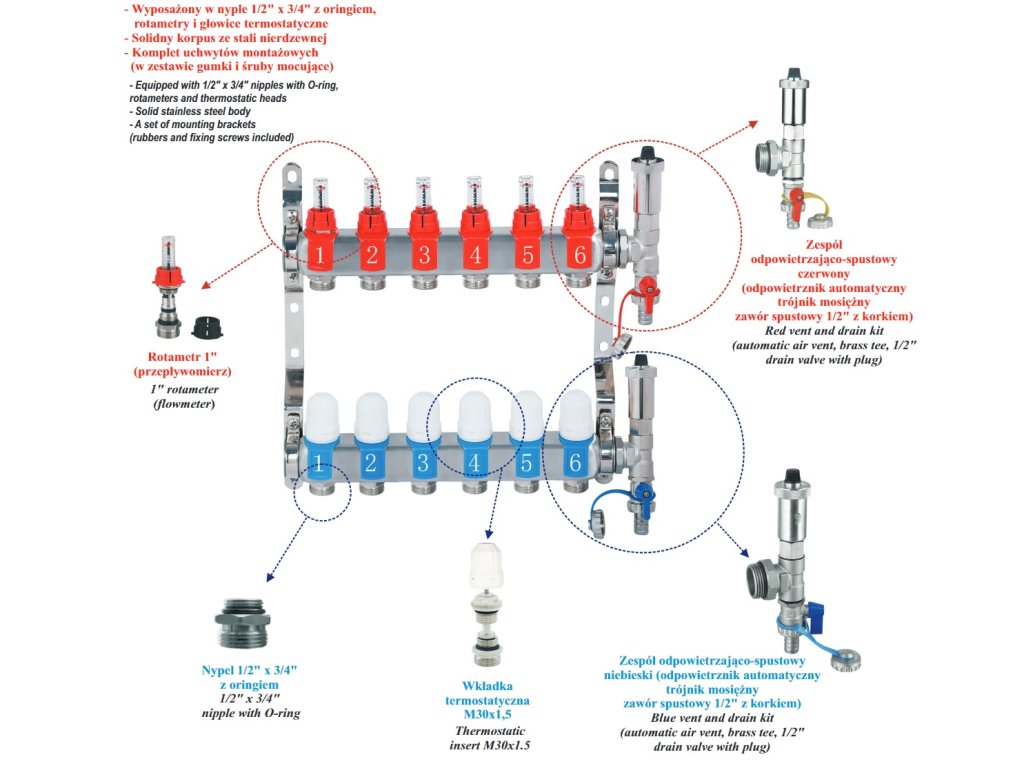 Integrované termostatické ventily umožňují přesné řízení průtoku vody v jednotlivých okruzích, zatímco průtokoměry poskytují okamžitý přehled o průtoku vody v systému.
