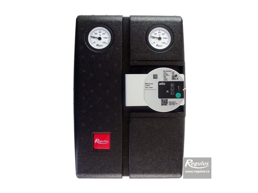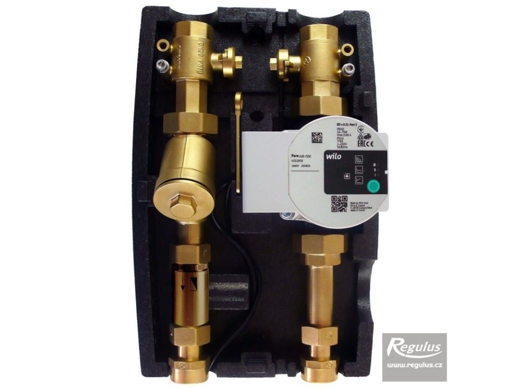 Dvoutrubková čerpadlová skupina s nízkoenergetickým oběhovým čerpadlem Wilo PARA 25/6 SC, filtrem s magnetem, zpětným ventilem pod filtrem, kulovými kohouty, teploměry a šroubeními pro připojení k rozdělovači. Umožňuje uzavření otopných okruhů, kontrolu teplot a snadný servis.